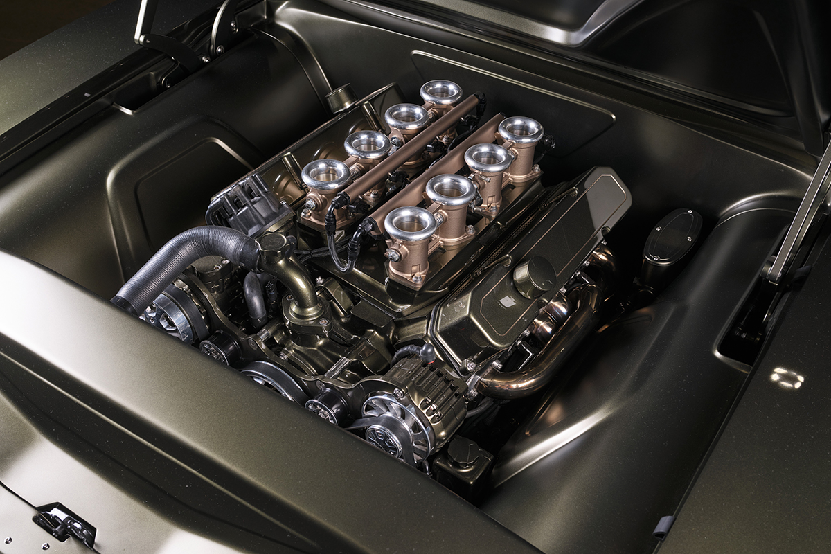 The Charger is powered by its original 440c.i. engine though it has been entirely rebuilt and detailed to the nines. A trick Borla 8-stack induction system manages the air/fuel delivery via a Holley EFI system. The engine compartment has been entirely redesigned with smooth, contoured fender wells, firewall panels, and radiator core.