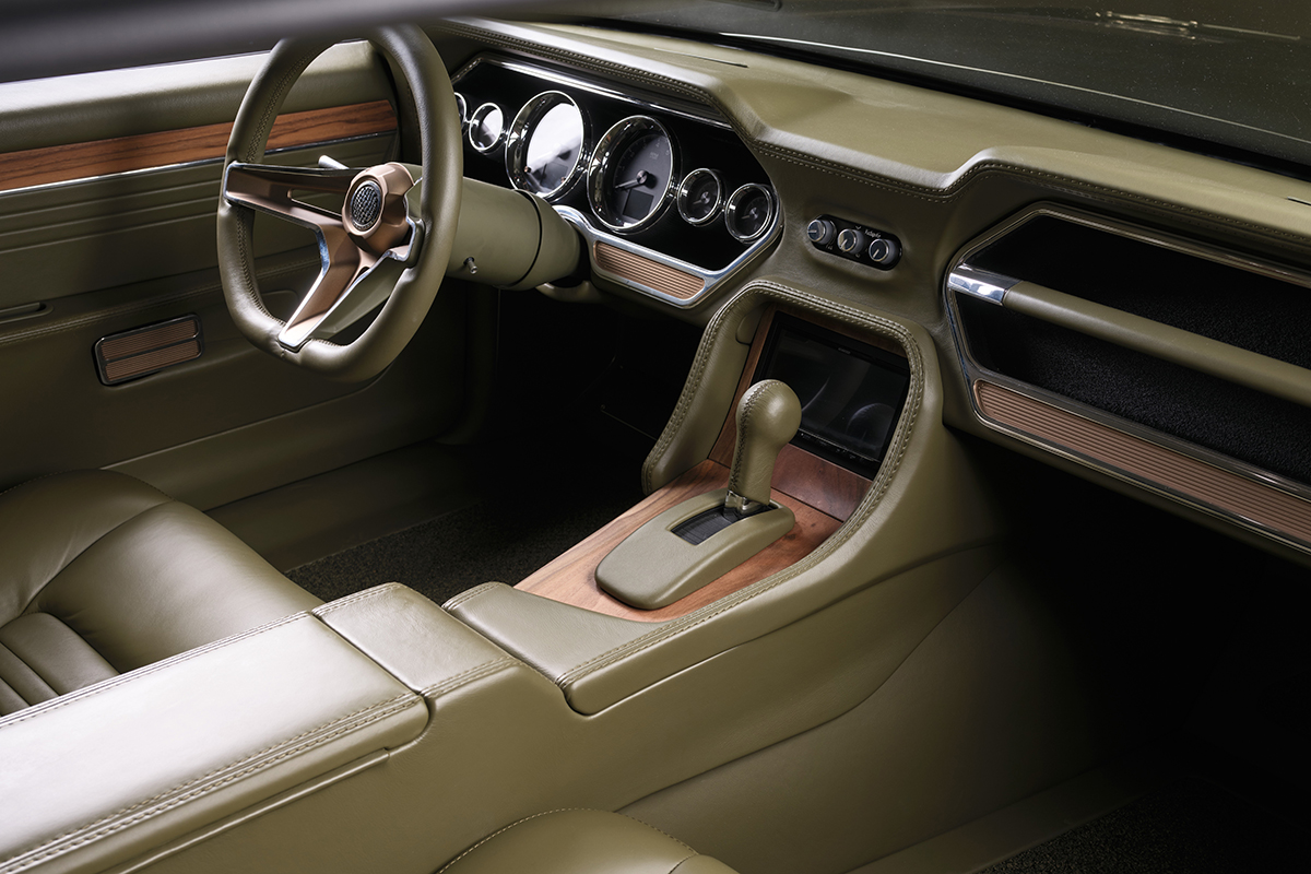 A glance into the interior reveals a highly modified dash filled with Dakota Digital instruments and a Vintage Air system. The seats were completely reworked by CCS before being covered in Relicate leather, complemented by custom door panels.